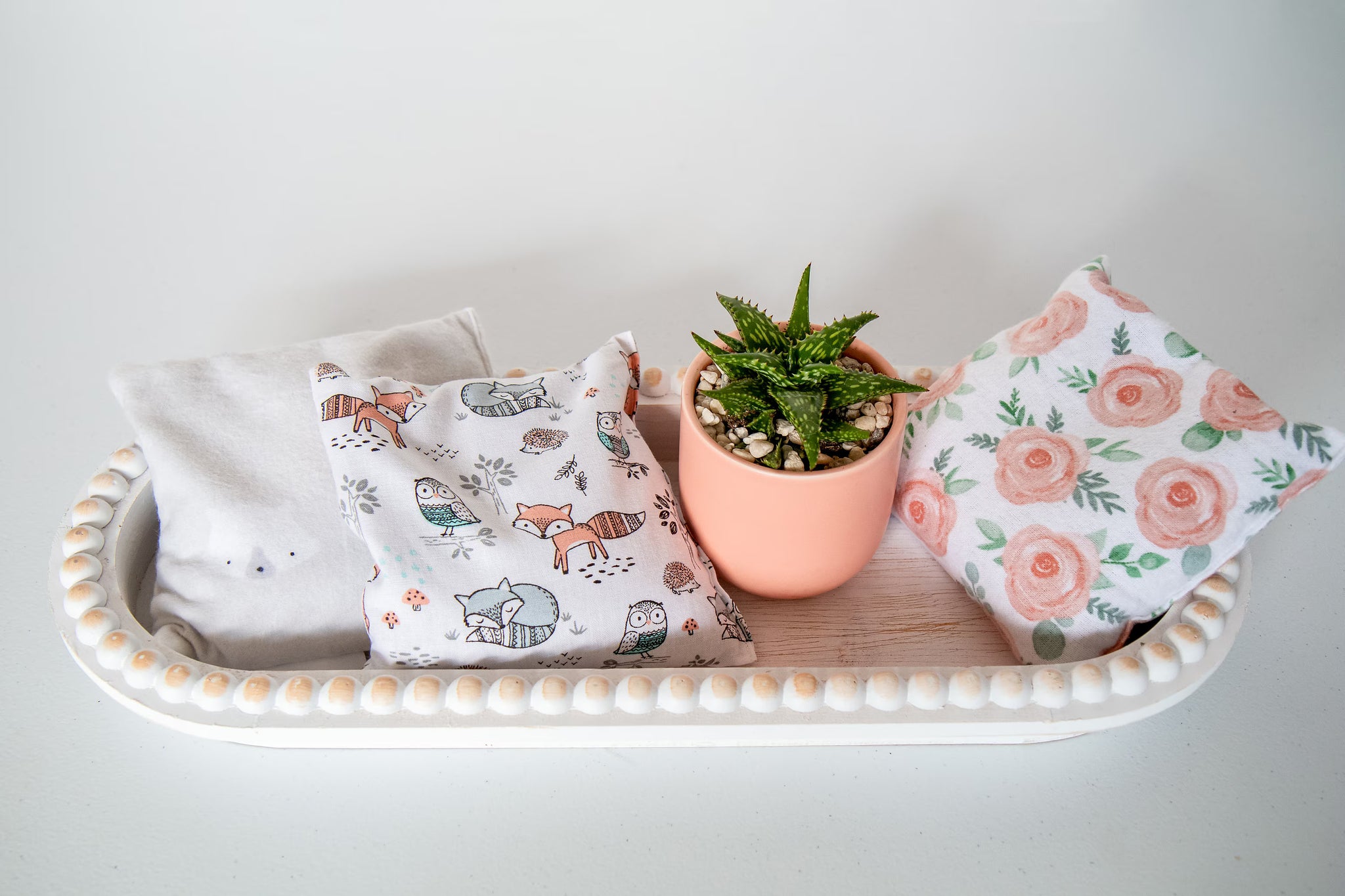 Our boo boo packs are filled with flax seed and dried herbs for soft comfort and long-lasting warmth. All wraps are filled with flax seed and have the options of lavender, lavender and peppermint, or peppermint for scents.